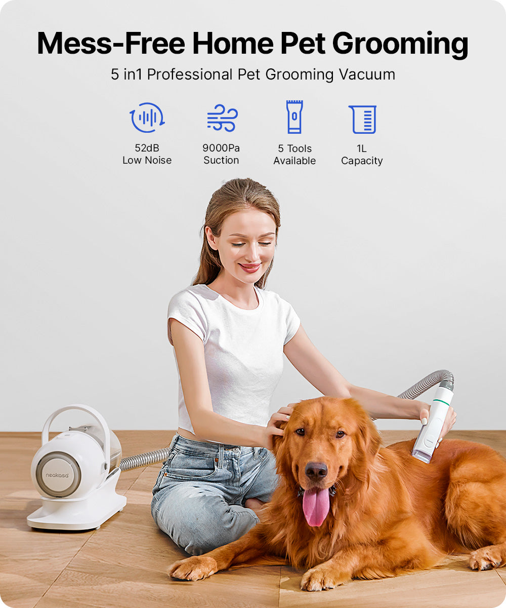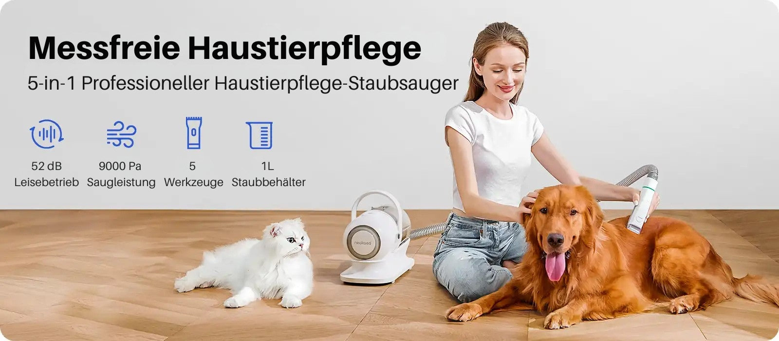 Neakasa P1 Pro Haustierpflege Staubsauger – die perfekte Symbiose aus Pflege und Reinigung. 9000 Pa Saugleistung entfernt mühelos lose Haare. 5 bewährte Aufsätze für ein makelloses Fell. Mit nur 52 dB sorgt er für Ruhe bei Tier und Halter.