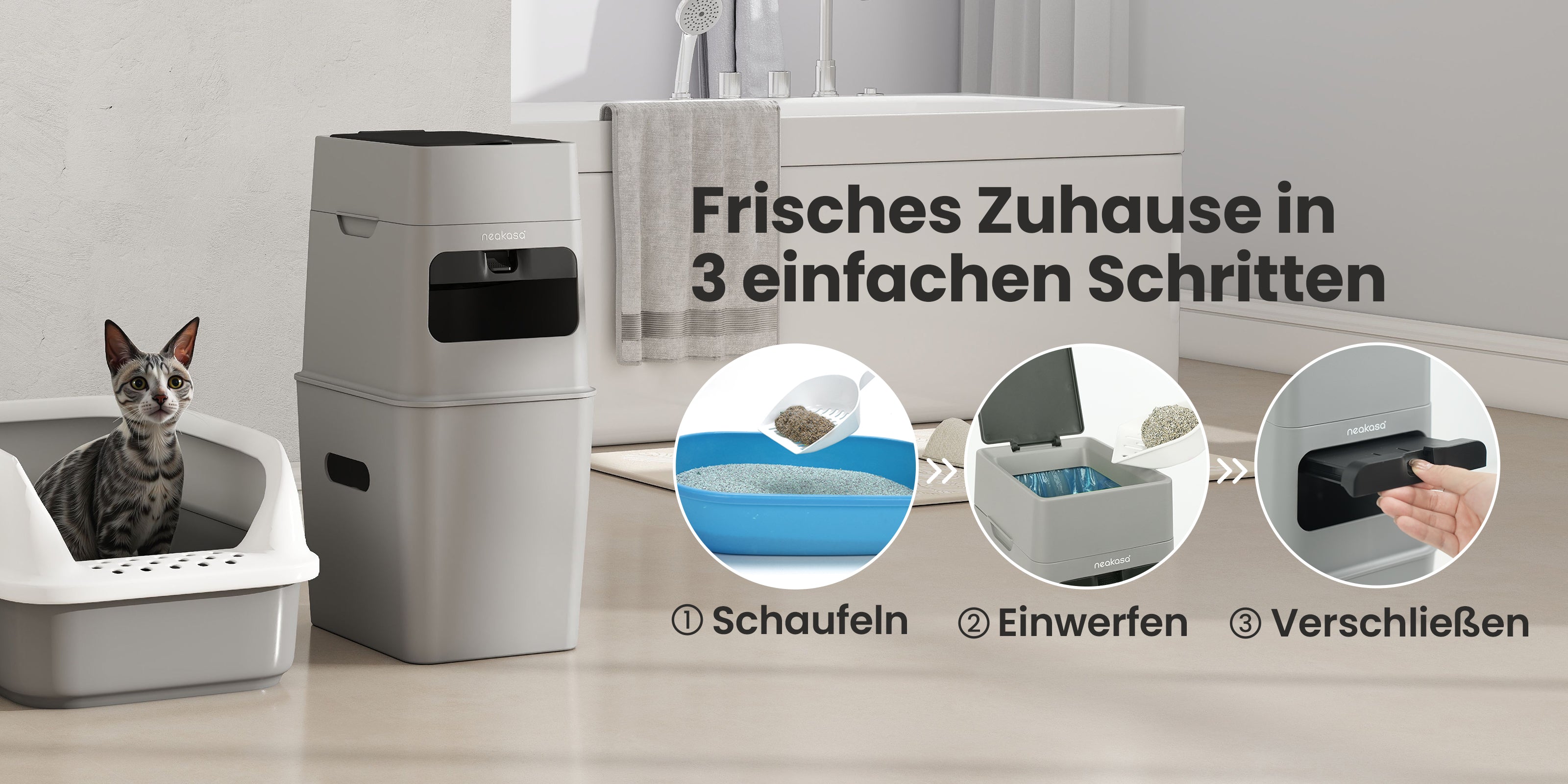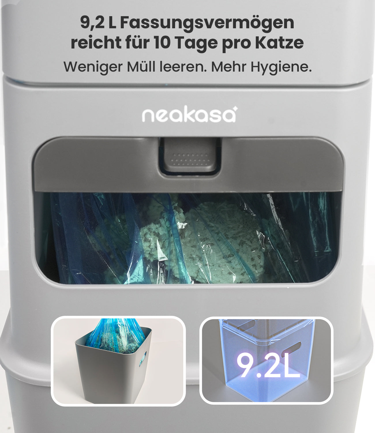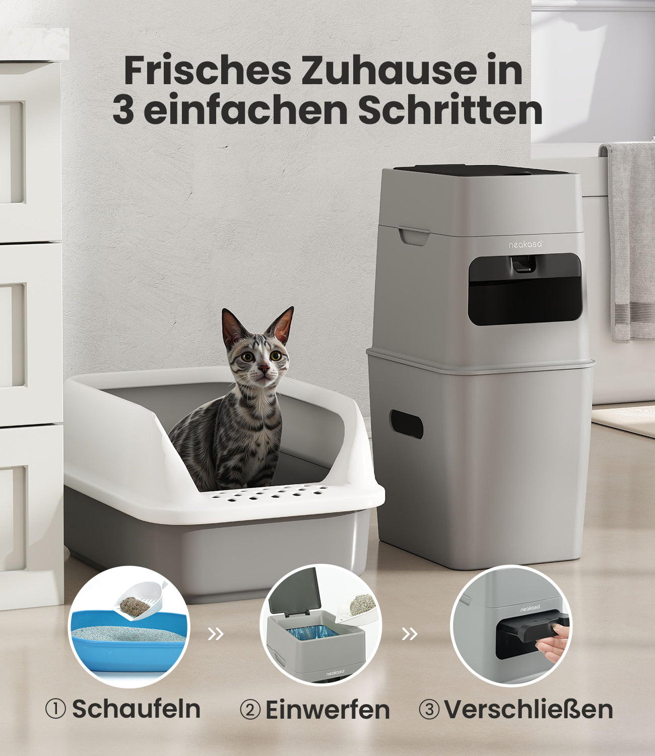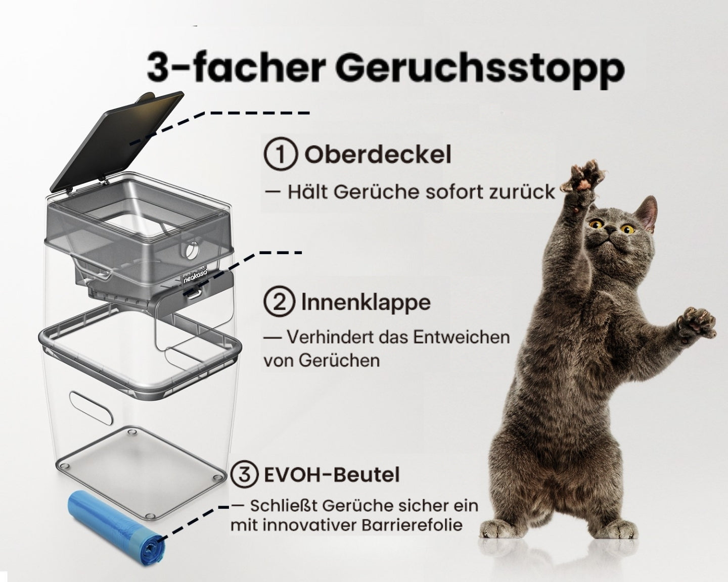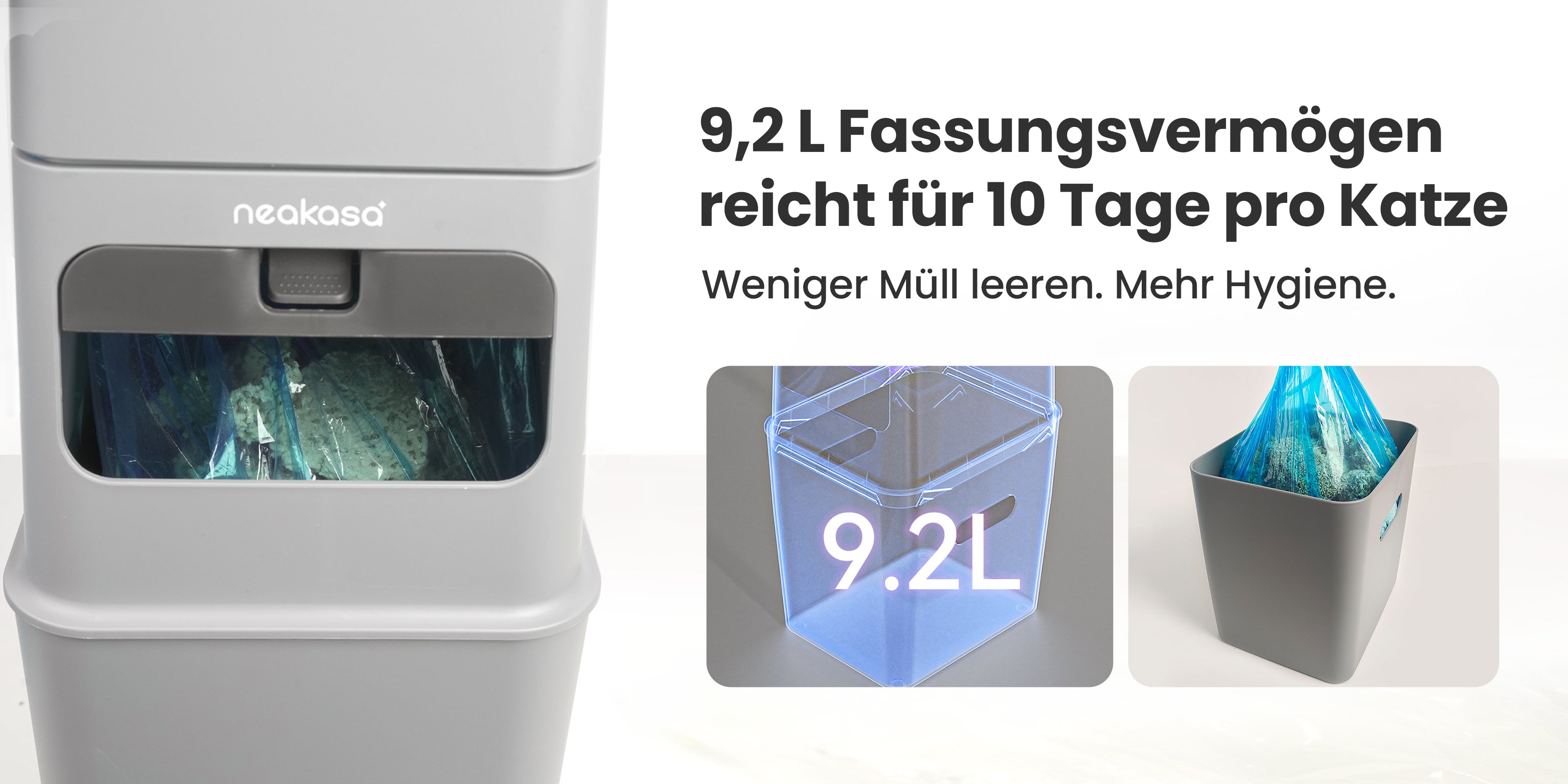 3-facher Geruchsstopp, 9,2 L Kapazität und extra starke Beutel – für eine einfache, hygienische Lösung im Katzenalltag.