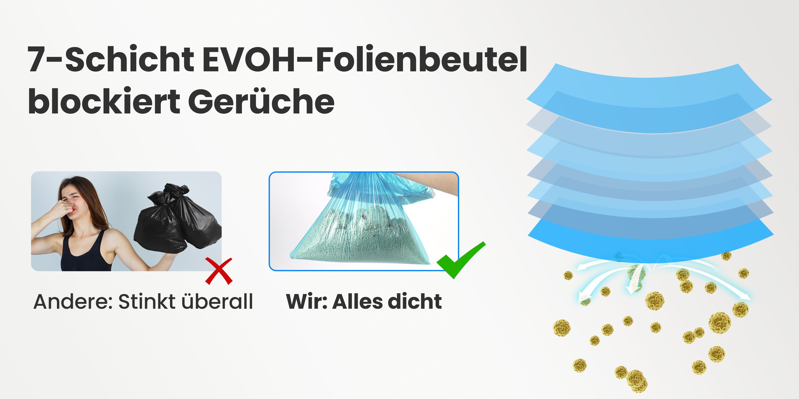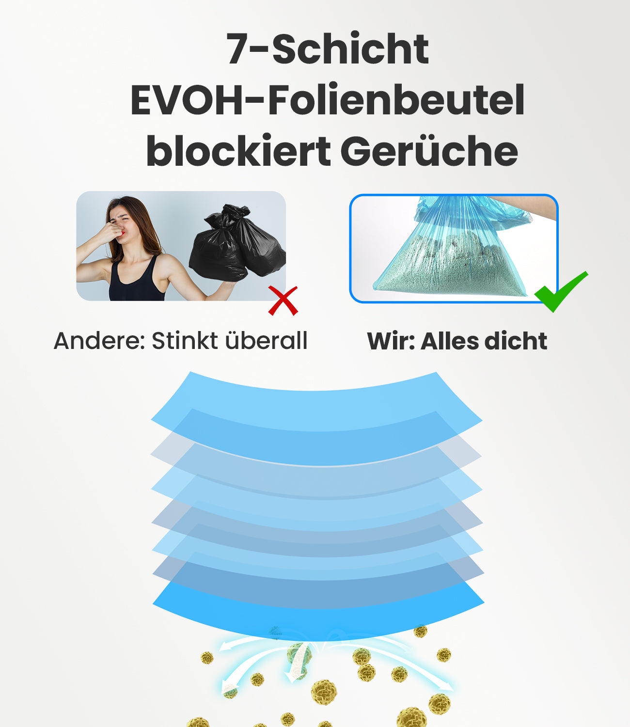 - Starker Geruchsschutz – 3-facher Geruchsstopp durch Deckel, Innenklappe und EVOH-Beutel