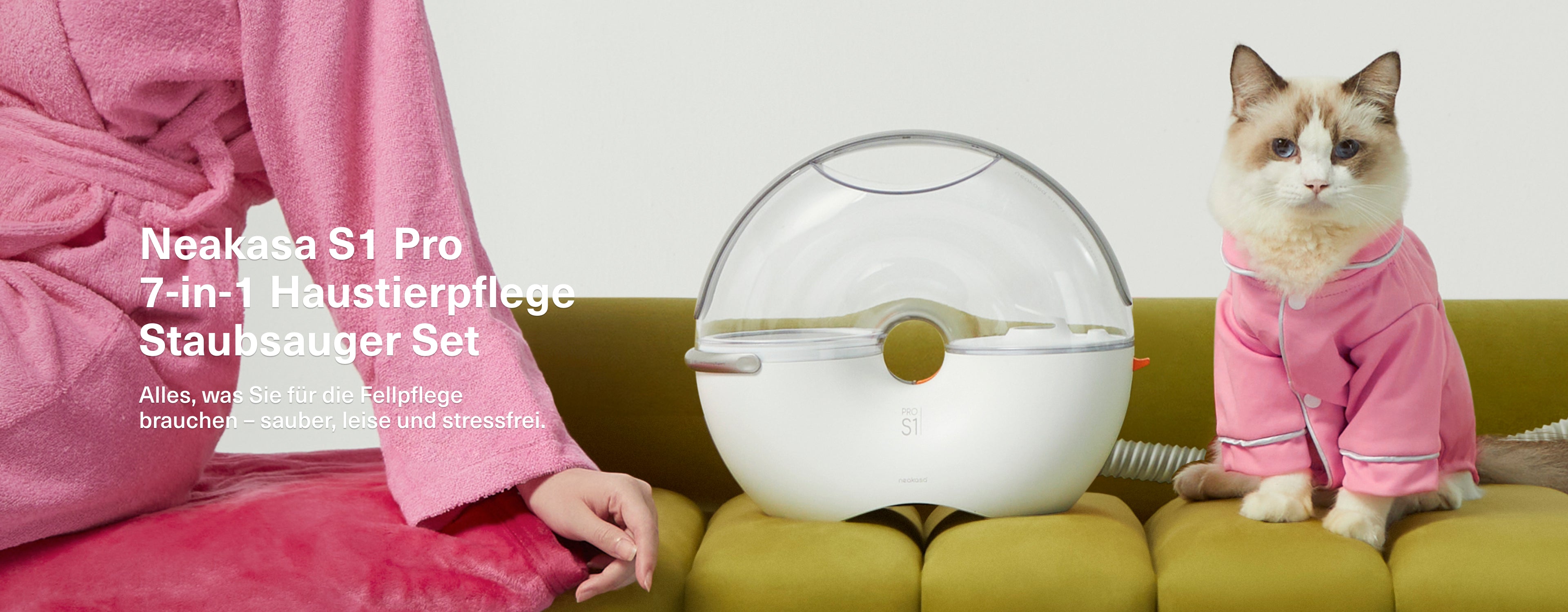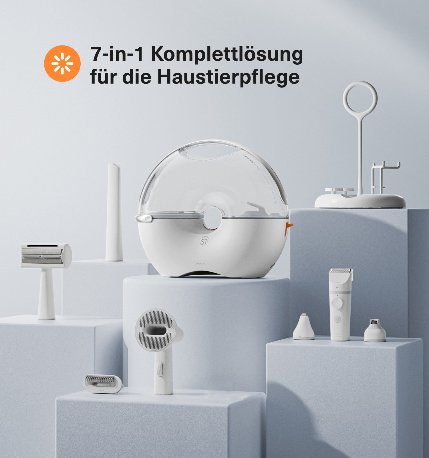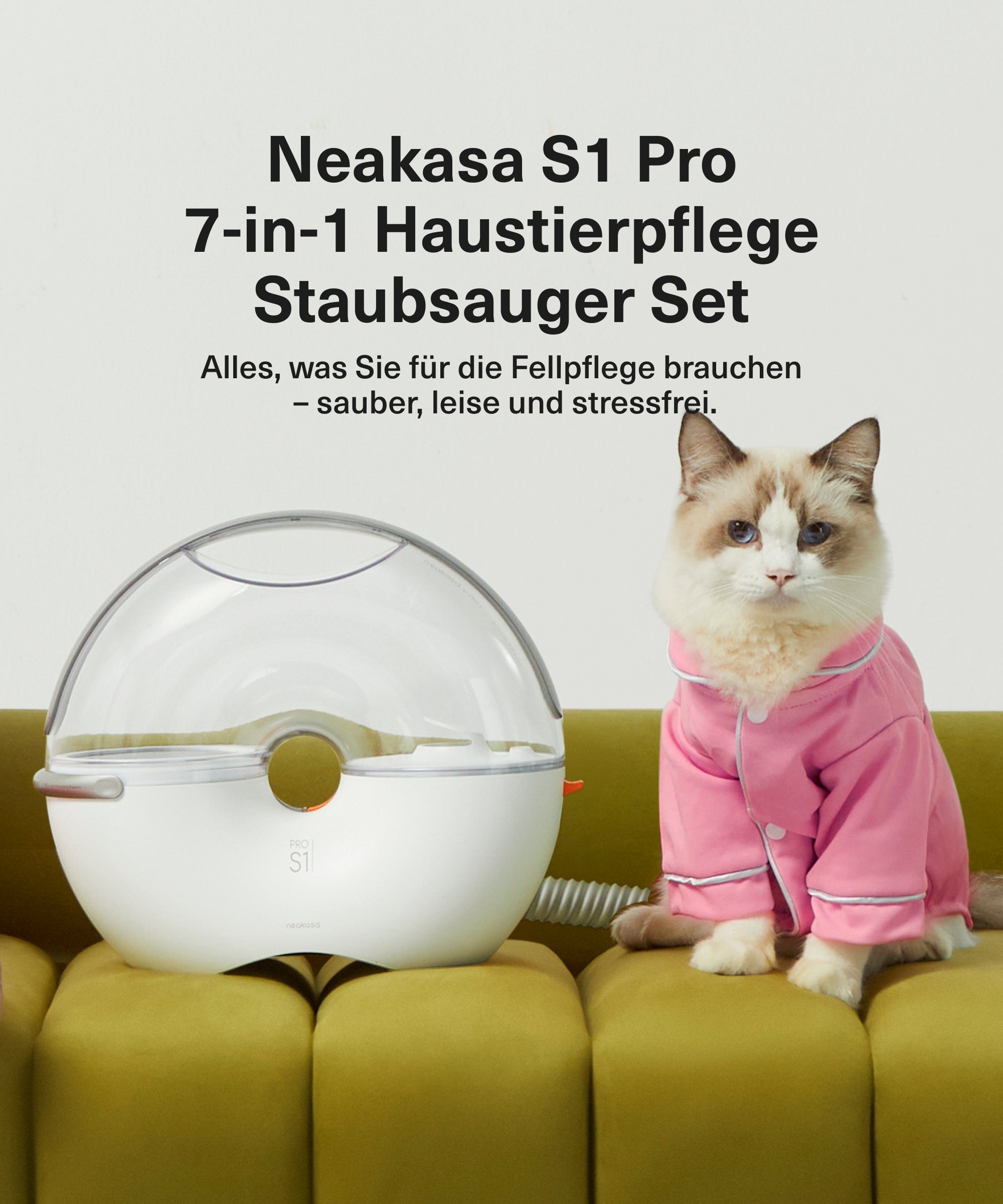 Der Neakasa S1 Pro ist ein multifunktionales Haustierpflege-Staubsauger-Set, das die Funktionen von Staubsauger, Entfilzer, Trimmer und Reinigungsgerät in einem Gerät vereint. Es unterstützt die Gesundheit des Fells deines Tieres und trägt gleichzeitig zu einer sauberen, haarfreien Wohnumgebung bei.
