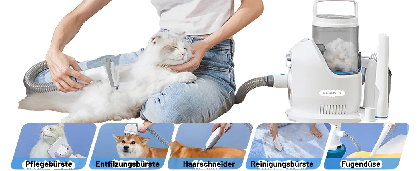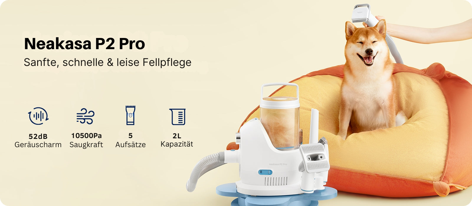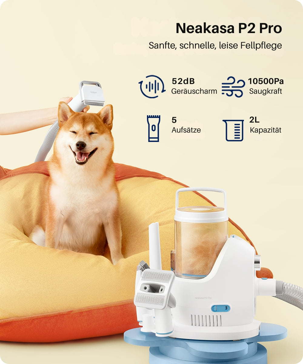 Neakasa P2 Pro ist ein All-in-One Pflegeset, einfach zu bedienen, effektiv und erschwinglich. Speziell für Haustiere zu Hause entwickelt, saugt es beim Bürsten lose Haare und Schmutz direkt auf.